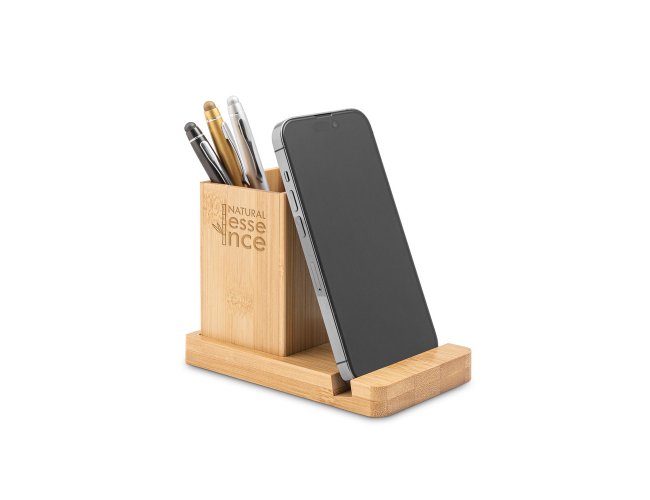 Conjunto de mesa em bambu, ideal para organizar o seu espaço de trabalho. Composto por 1 canaleta para suporte do seu celular e um copo, desmontável, para organizar as suas esferográficas e outros materiais de trabalho. Fornecido em caixa presente de papel kraft reciclado. A cor e o resultado da impressão nos materiais naturais pode variar entre produtos. Dimensões montado: 80 x 145 x 104 mm - Caixa: 80 x 145 x 33 mm