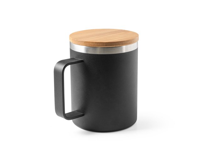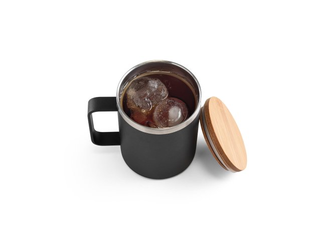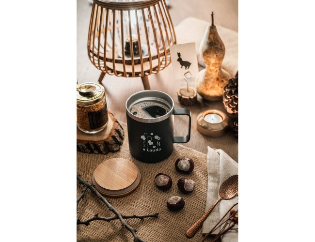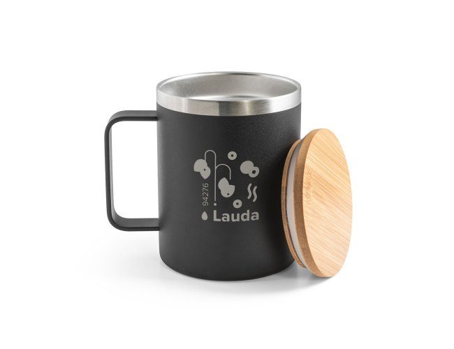 LAUDA. Copo de viagem em aço inox 90% reciclado, térmico com parede dupla isolada a vácuo e tampa em bambu 420 mL