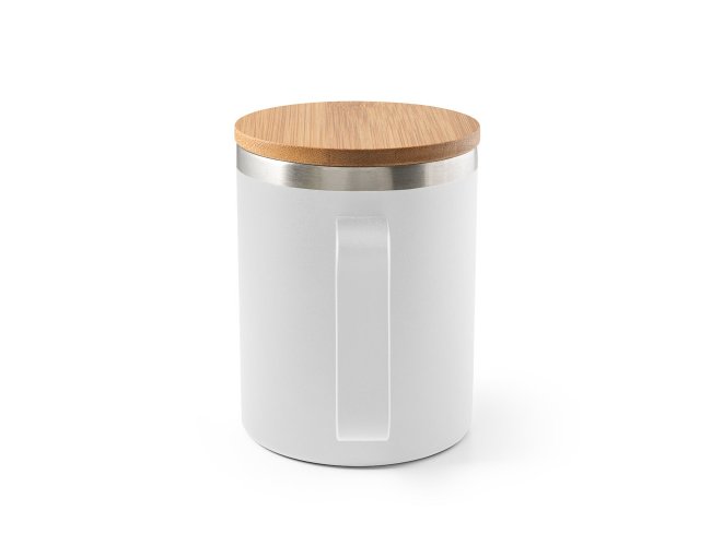 Copo de viagem térmico em aço inox 90% reciclado, com parede dupla isolada a vácuo e tampa em bambu. Esta caneca tem um revestimento em pó que lhe confere mais durabilidade e resistência. Capacidade até 420 mL. Fornecido em caixa presente de papel kraft reciclado. Certificação EU Food Grade. A cor e o resultado da impressão nos materiais naturais pode variar entre produtos. ø88 x 112 mm